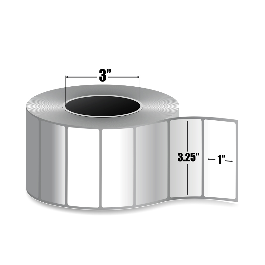 This 3.5" x 1" White Thermal Transfer label comes on a 3" core with a 8" outer diameter. There are 4 rolls per box and 5400 labels per roll.