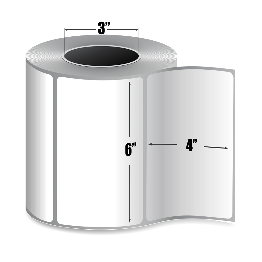 This 6" x 4" White Thermal Transfer label comes on a 3" core with a 8" outer diameter. There are 4 rolls per box and 1475 labels per roll.
