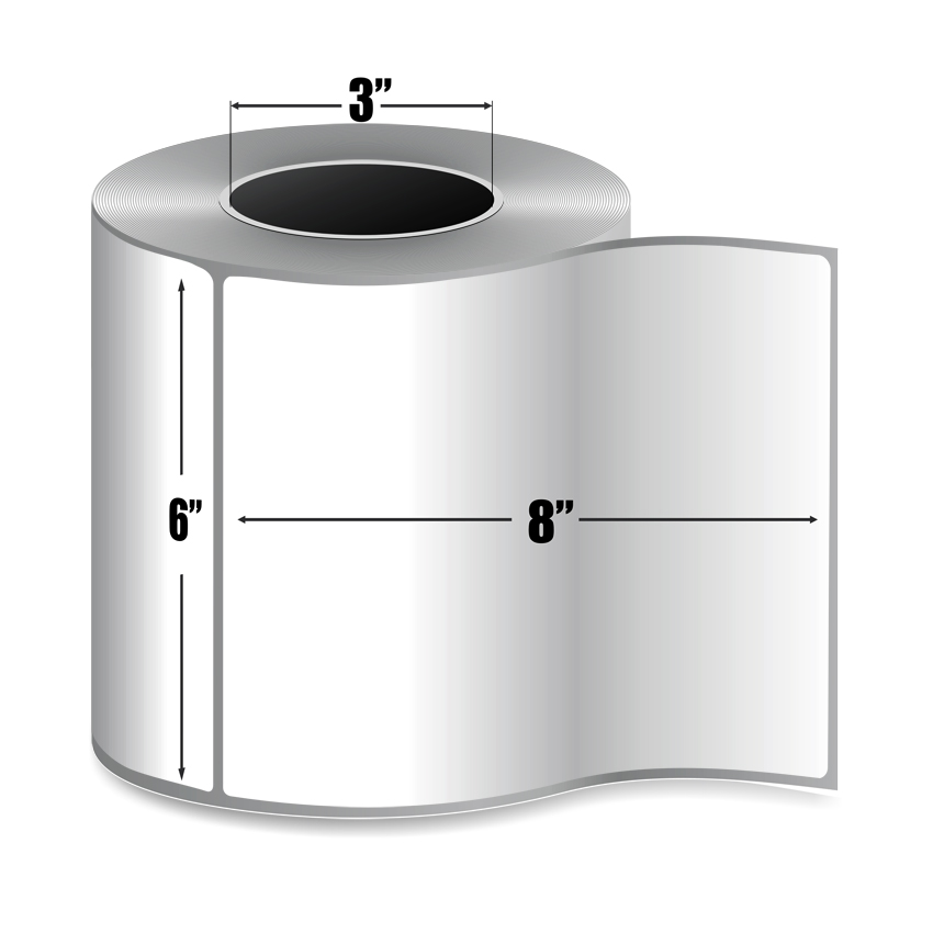 This 6" x 8" White Thermal Transfer label comes on a 3" core with a 8" outer diameter. There are 4 rolls per box and 750 labels per roll.