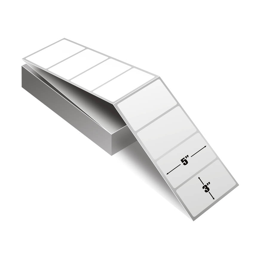 This 5" x 3" White Thermal Transfer label is fanfolded. There are 8000 labels per box.